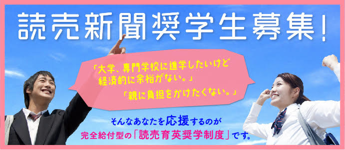 読売センター(読売新聞販売店=YC)で新聞配達をしながら完全給付の奨学金で、大学・専門学校に通います。 勉学と生活をパッケージで保障する読売育英奨学制度で、自分の未来に向かって、あなたもチャレンジしてみませんか?