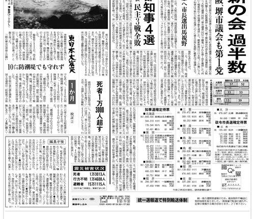 ◆号外 大阪府議選 維新の会 過半数 大阪、堺市議会も第1党 石原都知事4選 与野党対決民主3戦全敗